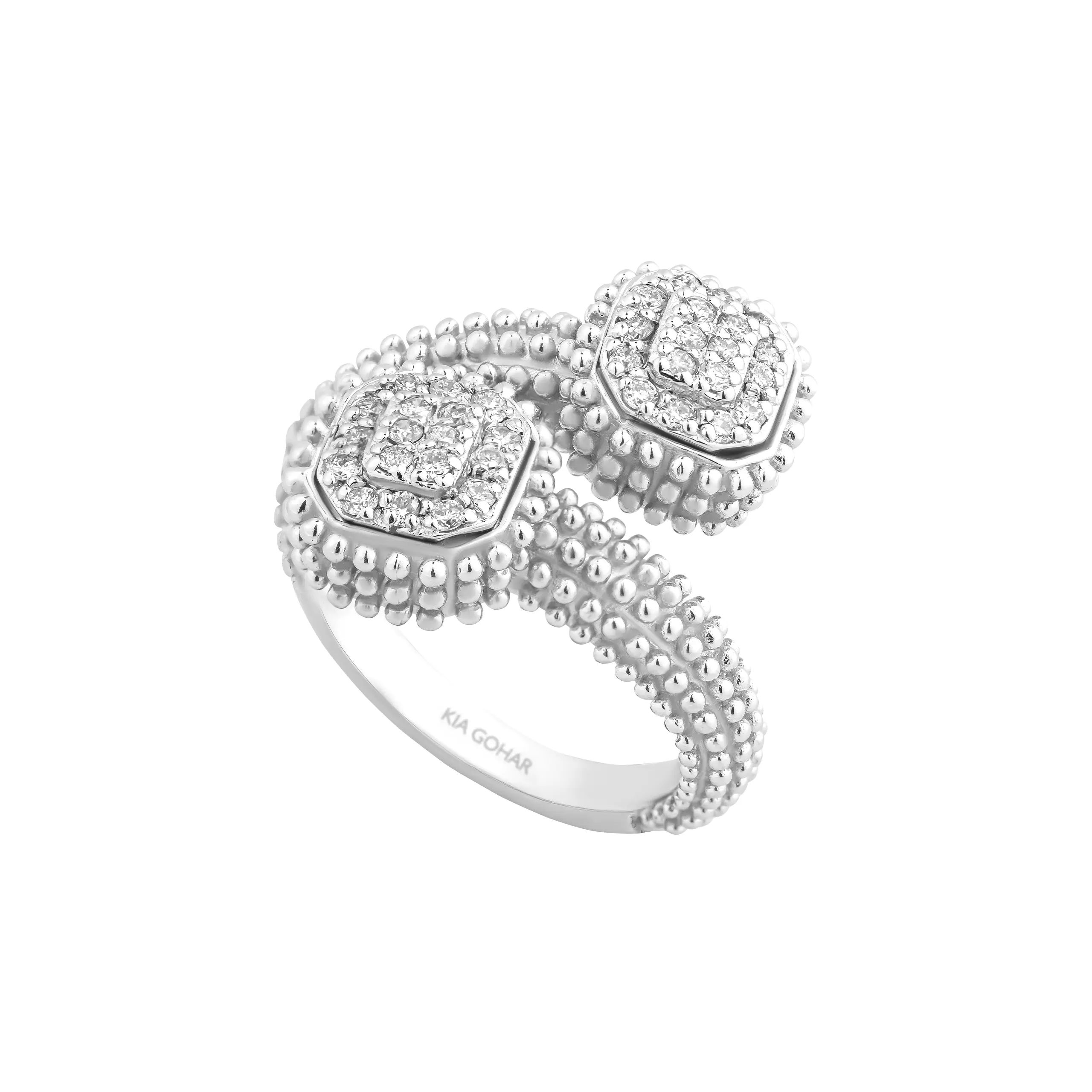 طراحی انگشتر زنانه کد ۳۴۵، این انگشتر یک طراحی Open Ring یا دو سر باز دارد که با الهام از فرمهای کلاسیک لوکس (Vintage) اما با ظرافتی مدرن ساخته شده است. روی هر سر انگشتر، یک سرپوش چندلایه با الماسهای ریز گرد (Pavé) دیده میشود که ترکیب زیبایی از بافت گوی ها و درخشش الماسها ایجاد کرده. تمام بدنه با گویهای ریز (Beaded Texture) پوشانده شده که انگشتر را کاملاً از مدلهای معمول متمایز میکند و آن را مختص افرادی یونیک و خاص پسند می کند